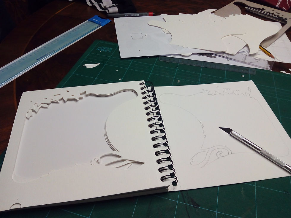 Una vez entendido (más o menos) el concepto, busque ejemplos de posibles ideas que, a mi parecer, eran interesantes y bonitas. Sin embargo no veía la manera de llevarlas a cabo muy bien, hasta que encontré unos libros, de varios diseñadores, que al abrirse en 360º, sus pàginas recortadas formaban un volumen alrededor del eje de la espiral o lomo.